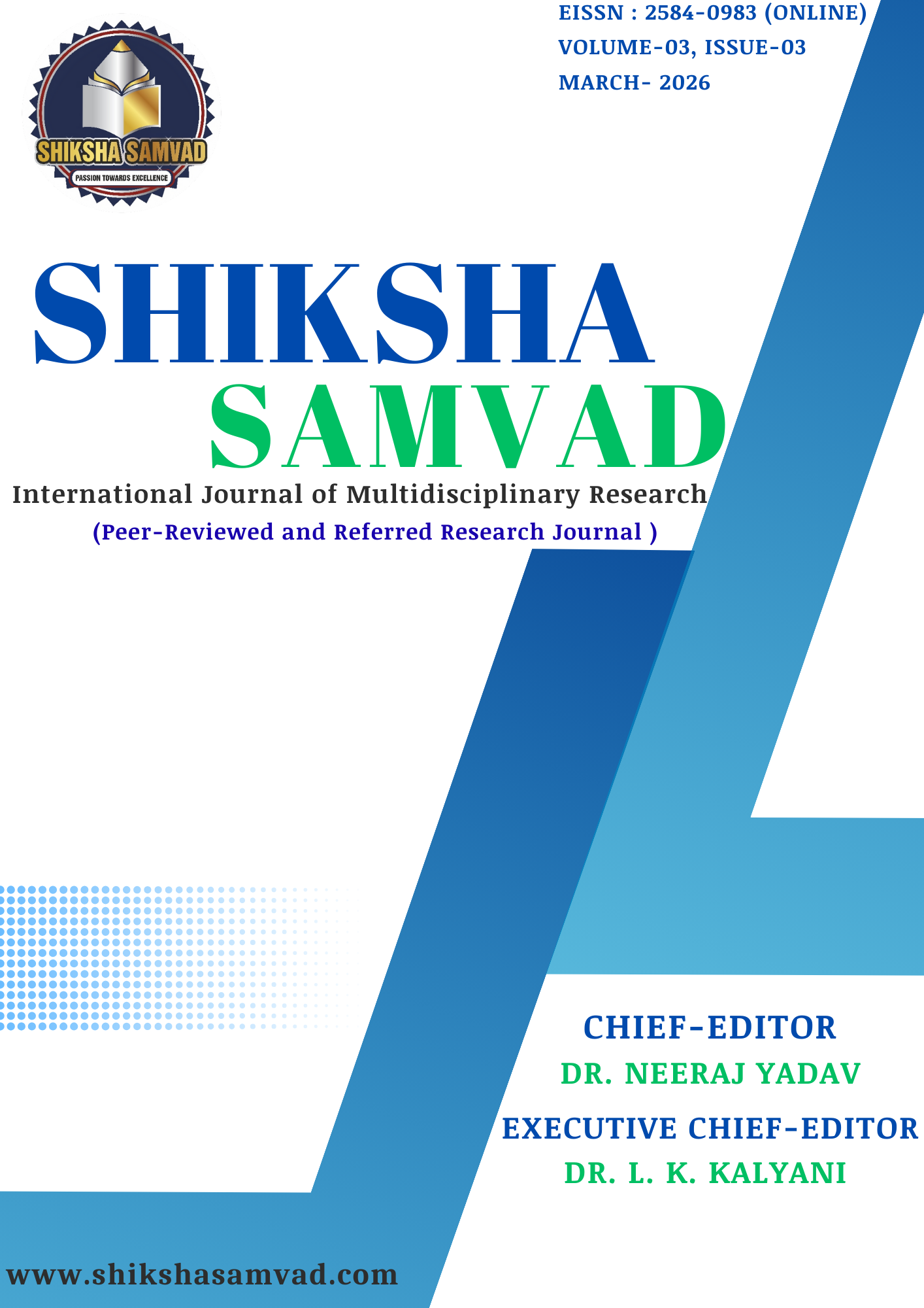 Volume-3, Issue-03, March 2026 Published: 08/03/2026 Research Articles Cover Page PDF Editorial Board PDF 01-07 Social Behaviour Theories in Education: Implications for Teaching, Learning, and Classroom Management Author: Anita Verma PDF 08-21 Equity and Excellence: Research on Culturally Responsive Pedagogy Author(s): Sonu Rajak, Pakeeza Khatoon, Dr. Abu Rehan & Uttam Kumar PDF 22-28 विकसित भारत की संकल्पना और लघु उद्योगों की भूमिका: एक भौगोलिक अध्ययन Author : डॉ.रमन प्रकाश PDF 29-41 Artificial Intelligence in Education: Enhancing Teacher Professional Development and Classroom Efficiency Author : Dr Monika Saini PDF 42-49 भारतीय ज्ञान परम्परा के मूलाधार: हमारे परम्परागत तथा आंचलिक खेलों में नैतिक आचरण Author : डॉ. बृजेश कुमार यादव PDF